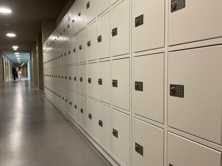 Die Schließfächer sind im Erdgeschoss neben der Aula.